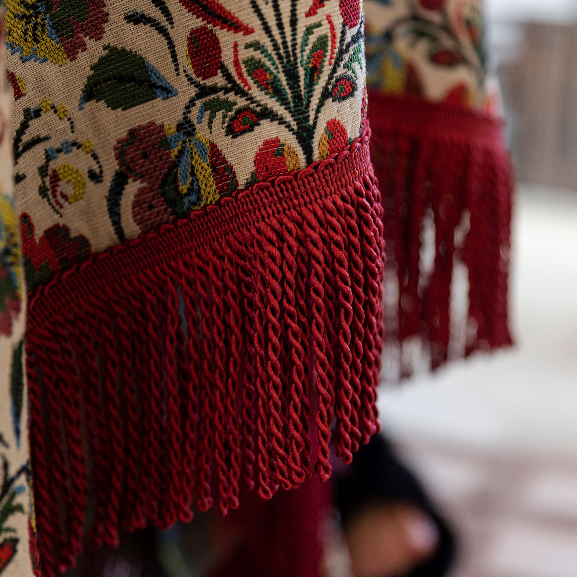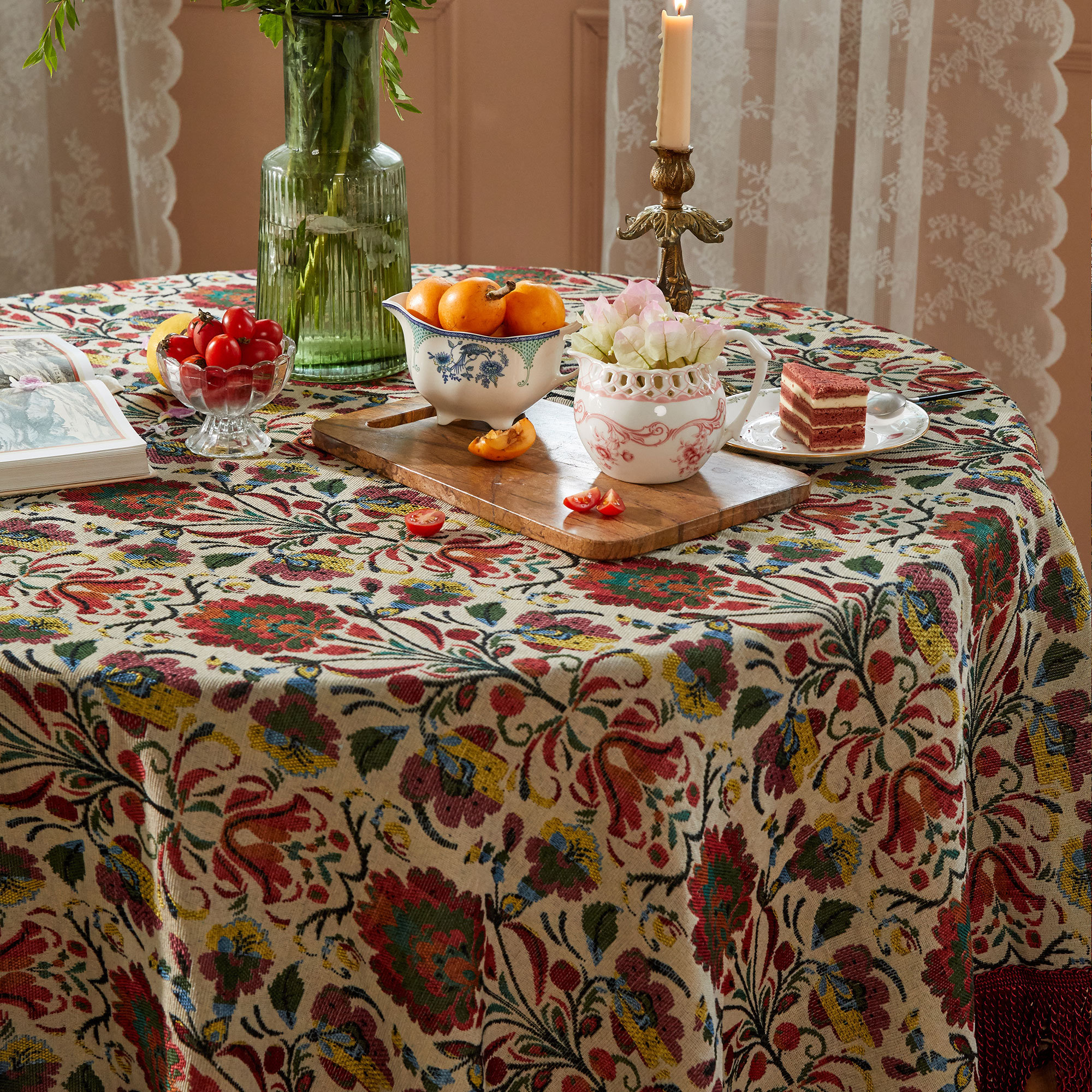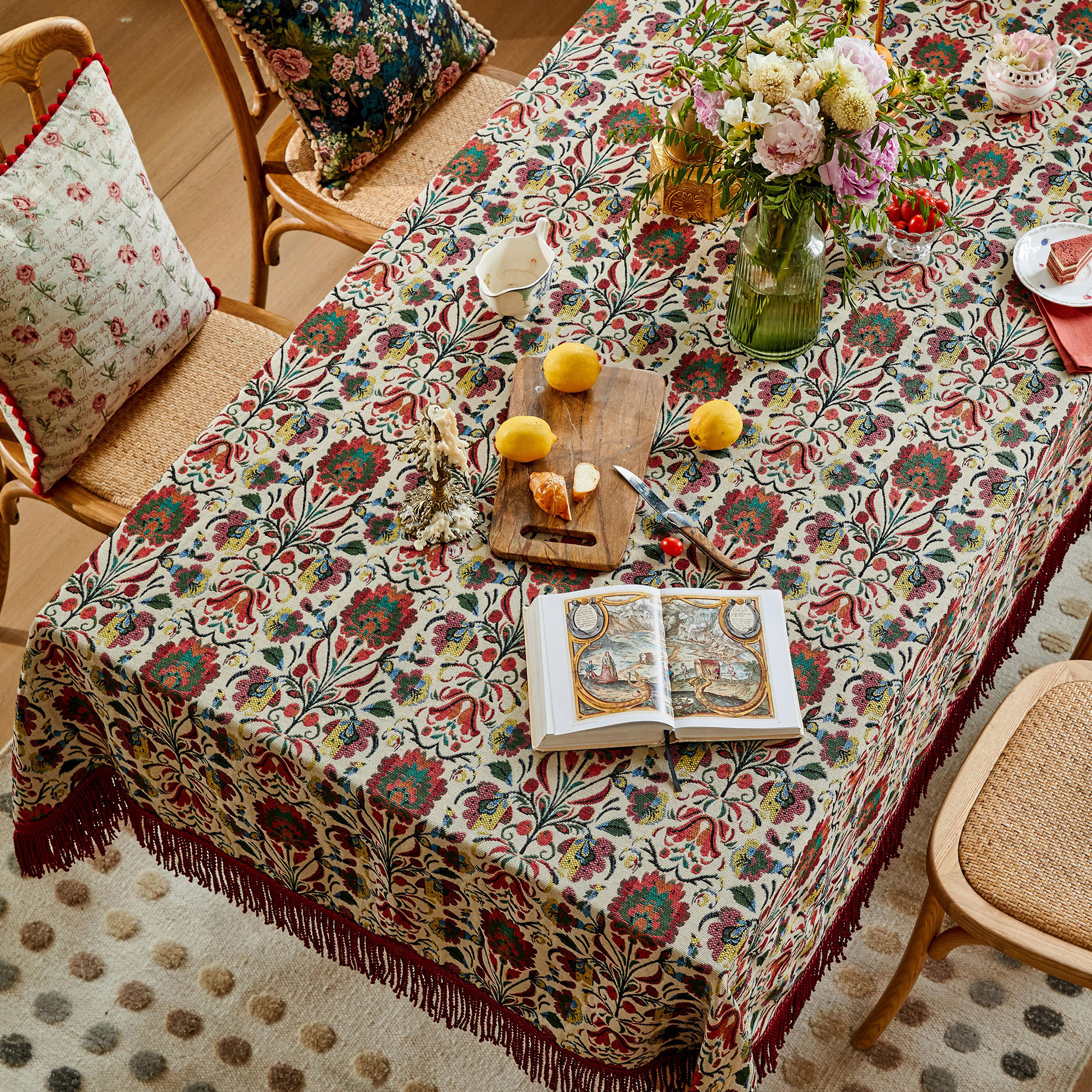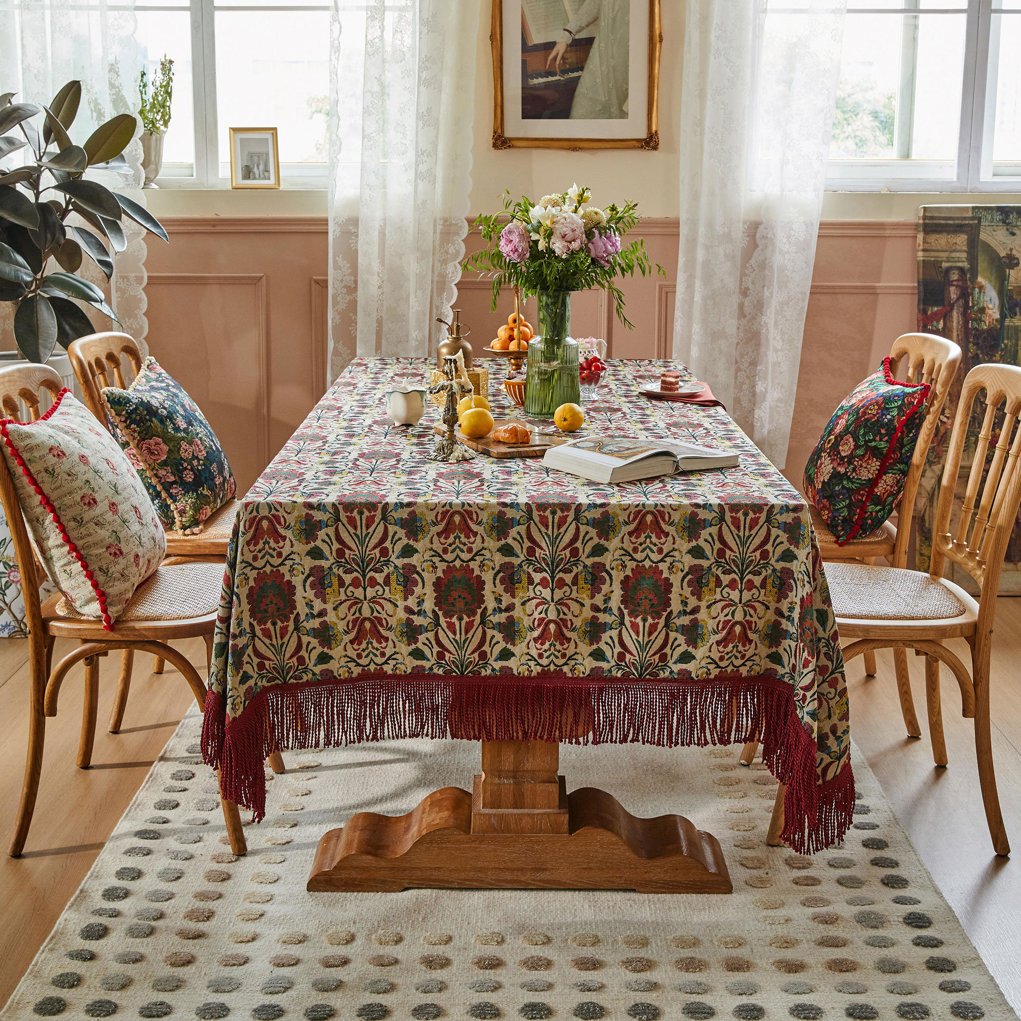 A beige-linen background contrasts with a vibrant, retro floral palette. Branches and blossoms are arranged in mirrored symmetry, while a burgundy fringe of long, flowing tassels gently sways as you walk, instantly transforming the dining table into a focal point filled with exotic charm.