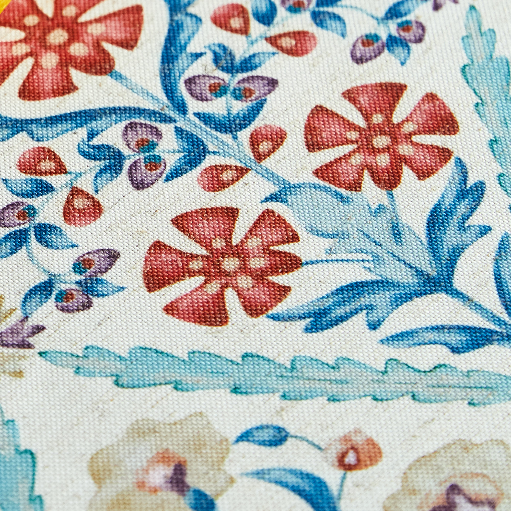 Multi-layered border: A narrow floral ribbon, a wide, misty blue border, and a dark blue binding create a clean, organized surface.