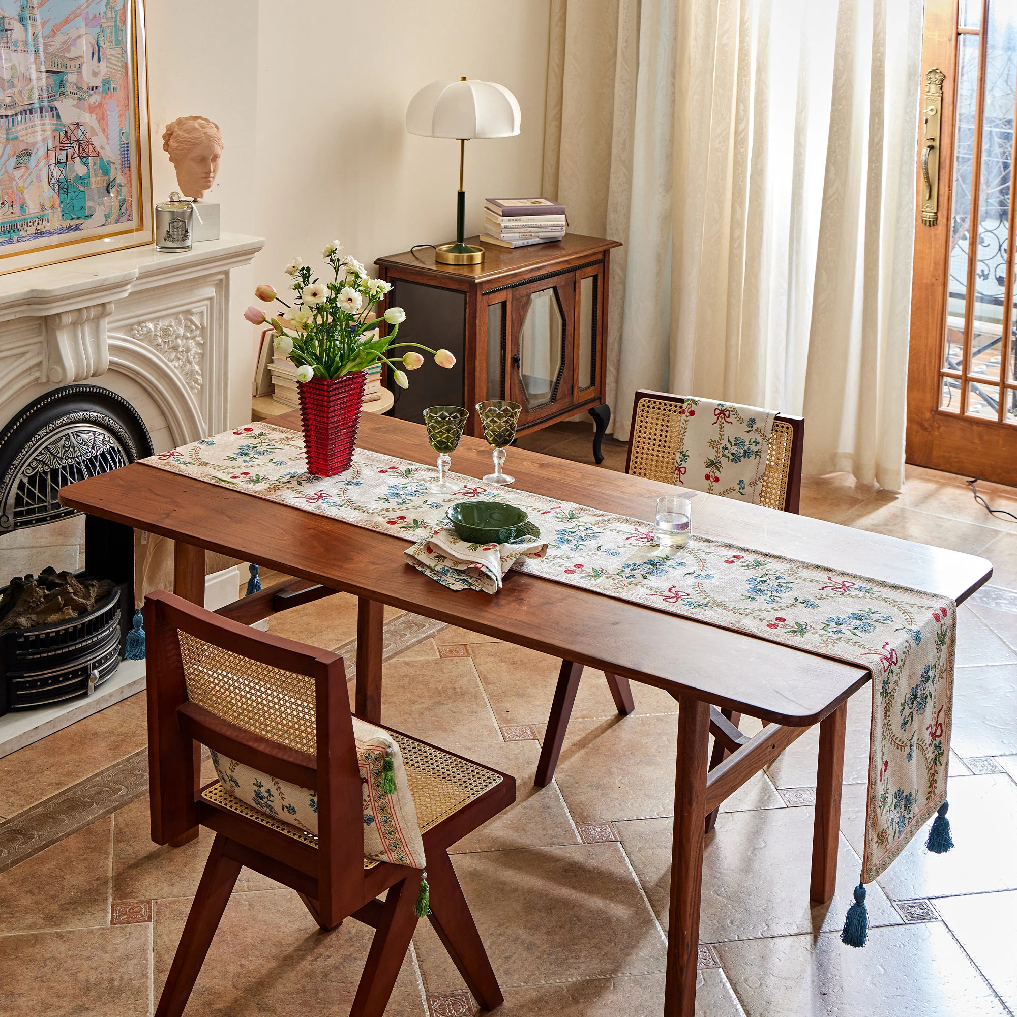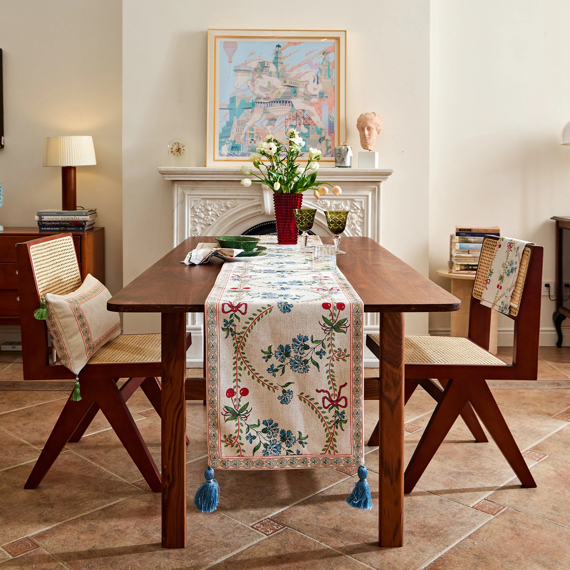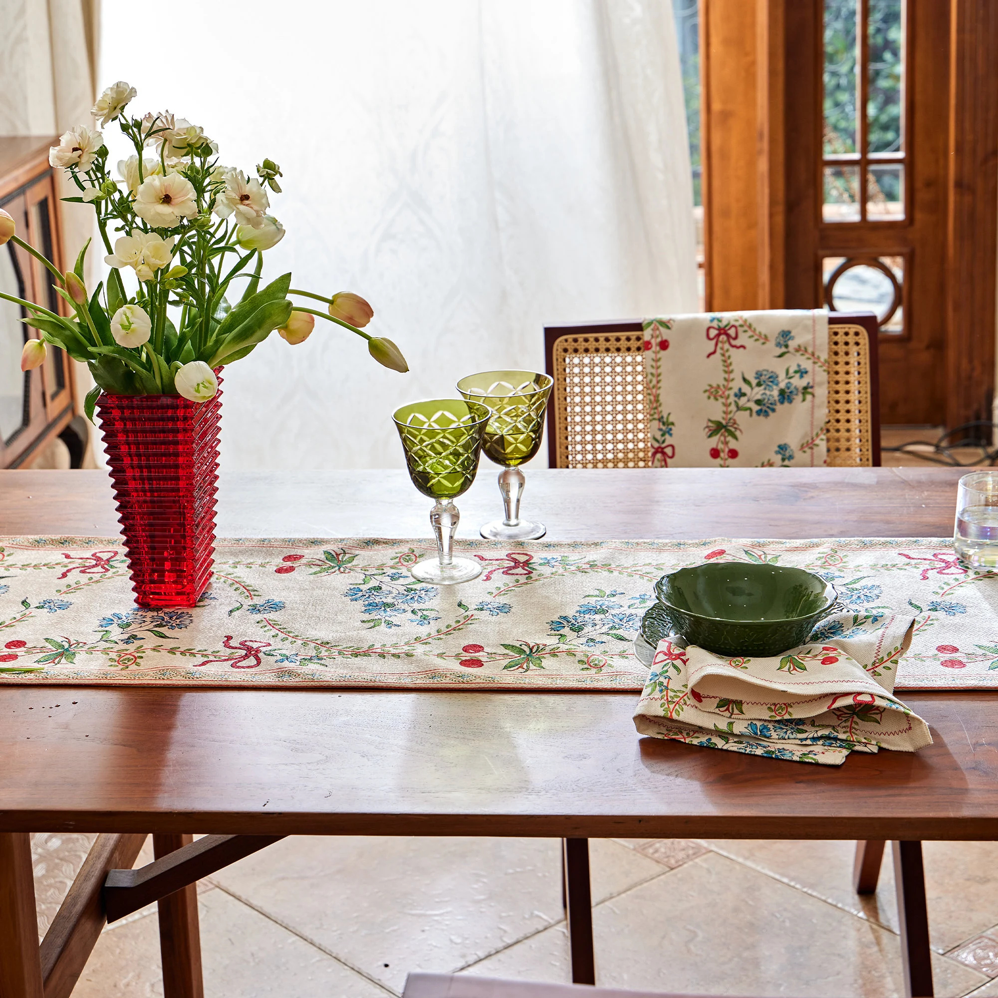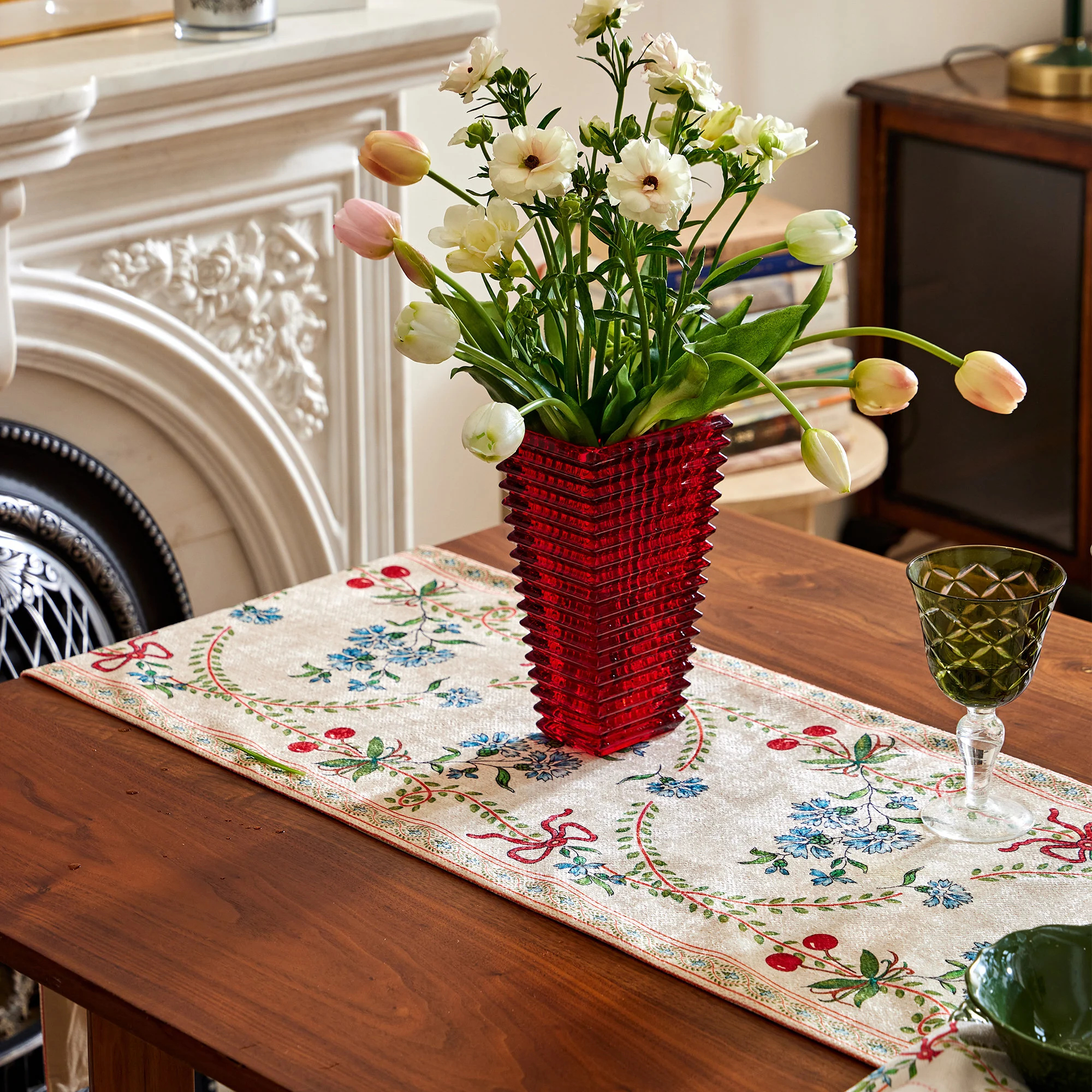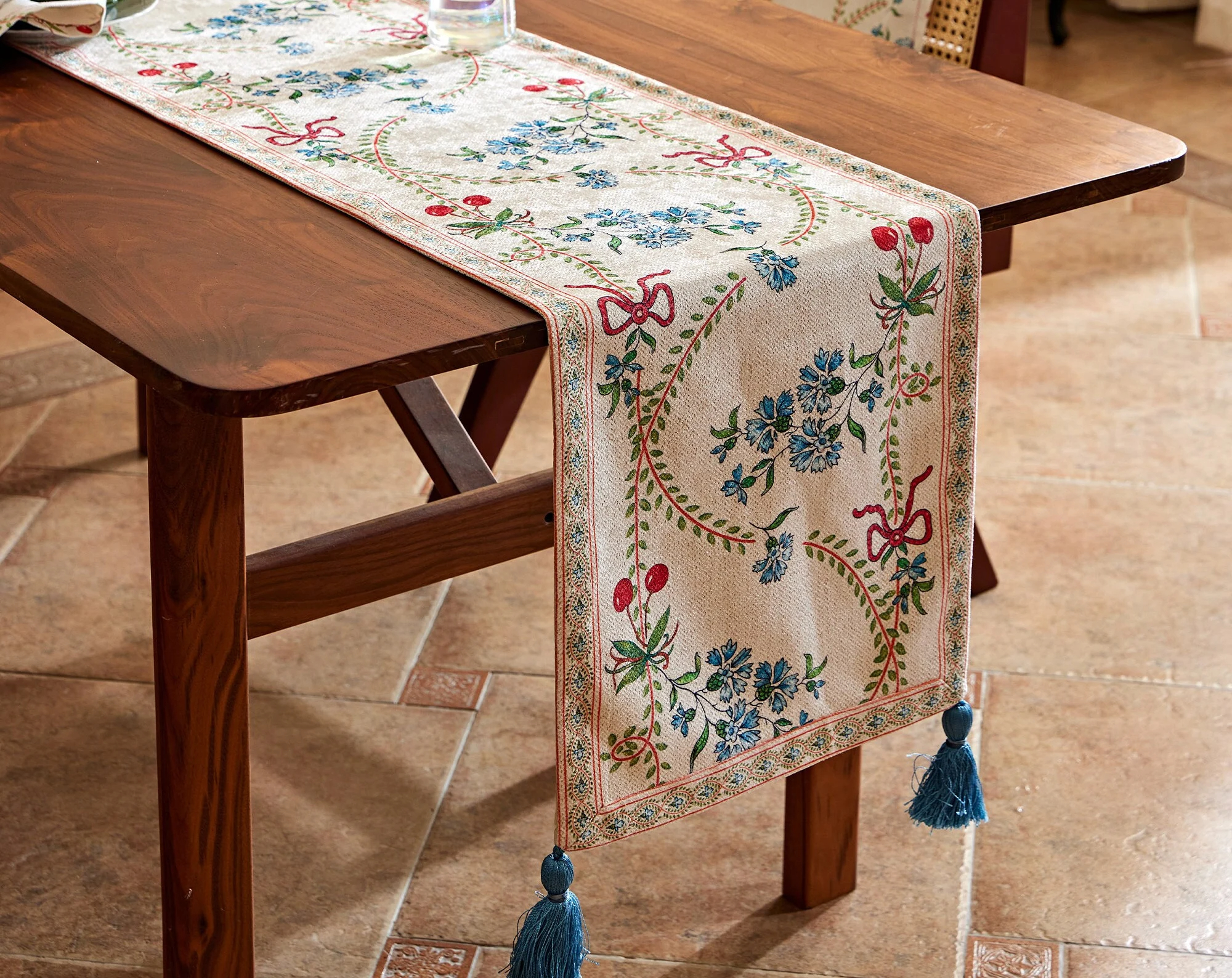 A beige-linen yarn-dyed base supports small blue flowers and tender green branches, while a red satin ribbon weaves gracefully through the composition. Delicate floral ribbons frame the edges, and matching tassels embellish the ends, adding a touch of movement and a sense of ceremony. Layered with a solid tablecloth, it creates a gentle yet striking effect.