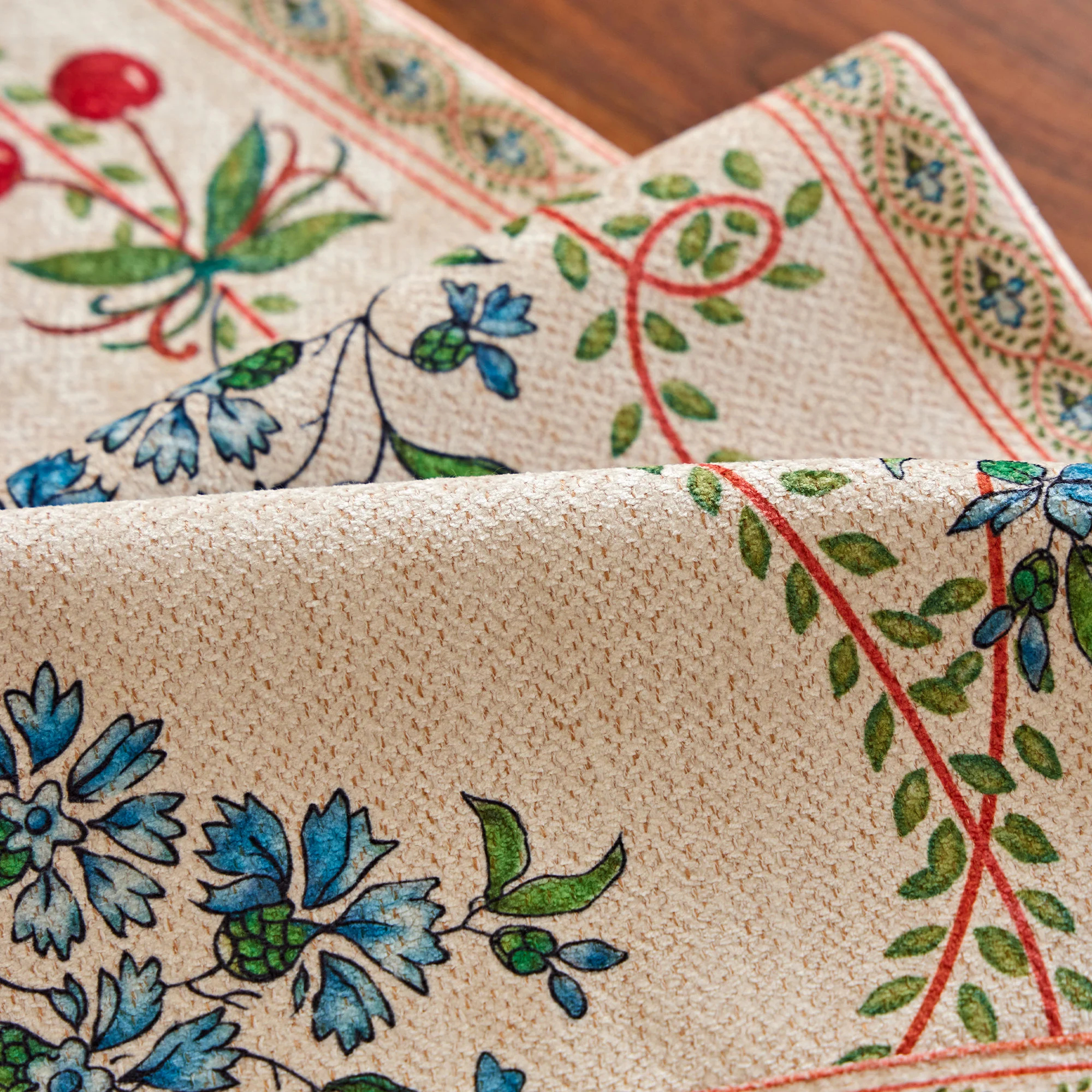 A soothing color scheme: a beige-linen base with aquamarine flowers and berry red accents creates a refreshing and enduring aesthetic, perfect for all seasons.