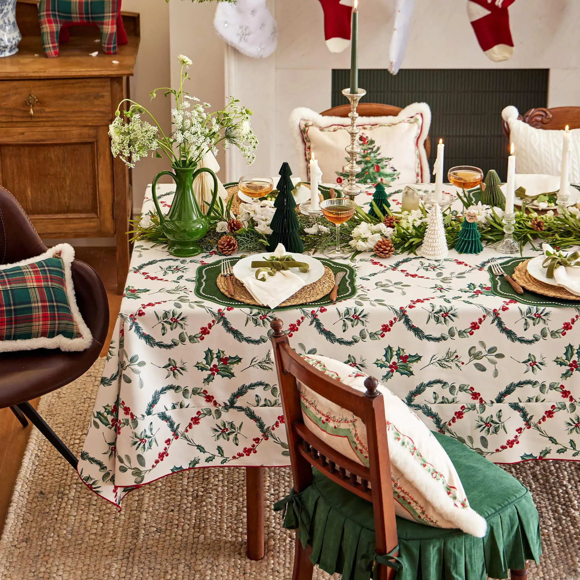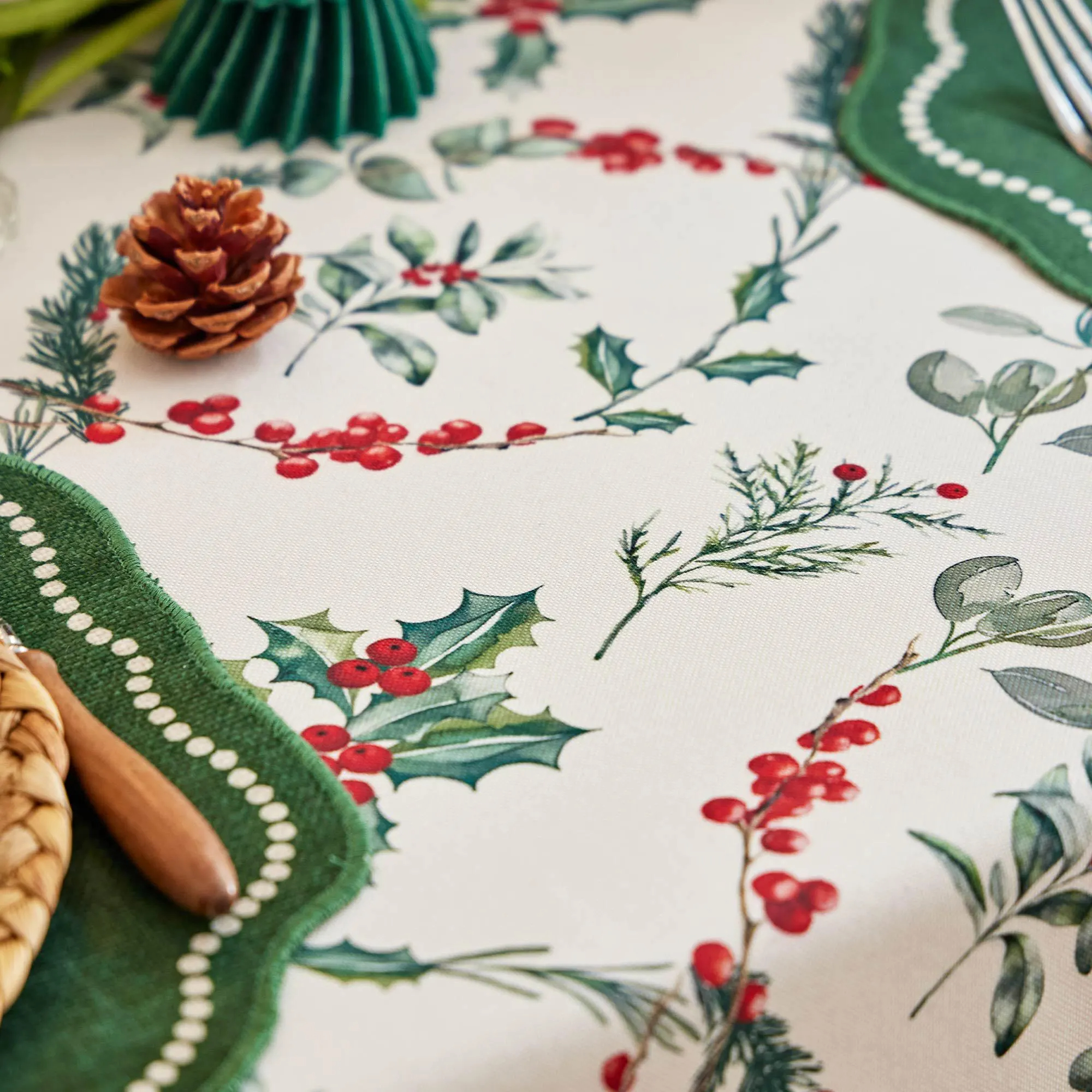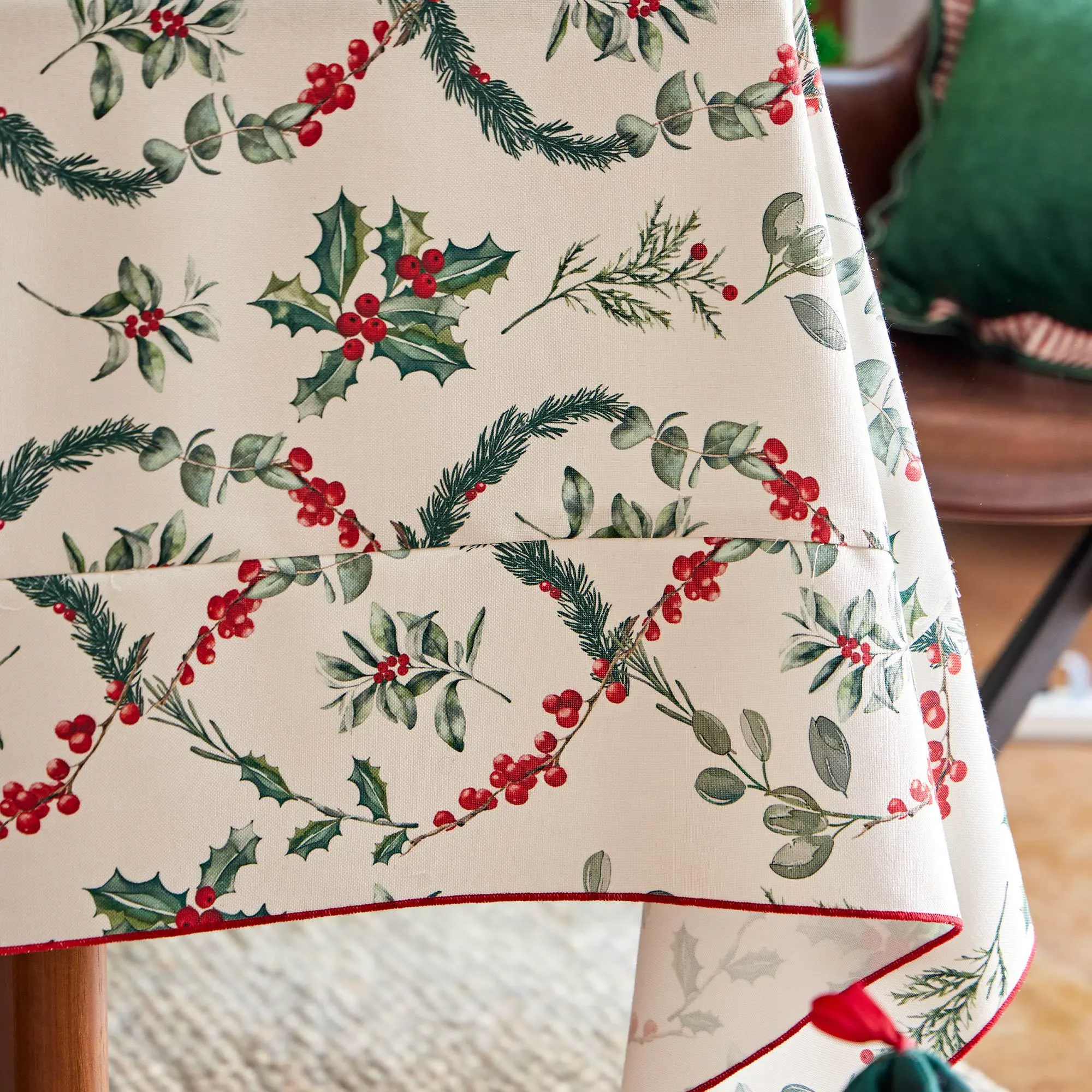 Amidst a creamy beige background, holly leaves, pine branches, and red berries form a series of small garlands, arranged diagonally. Fine red piping creates a refreshing yet restrained ambiance, perfect for both festive and everyday occasions.