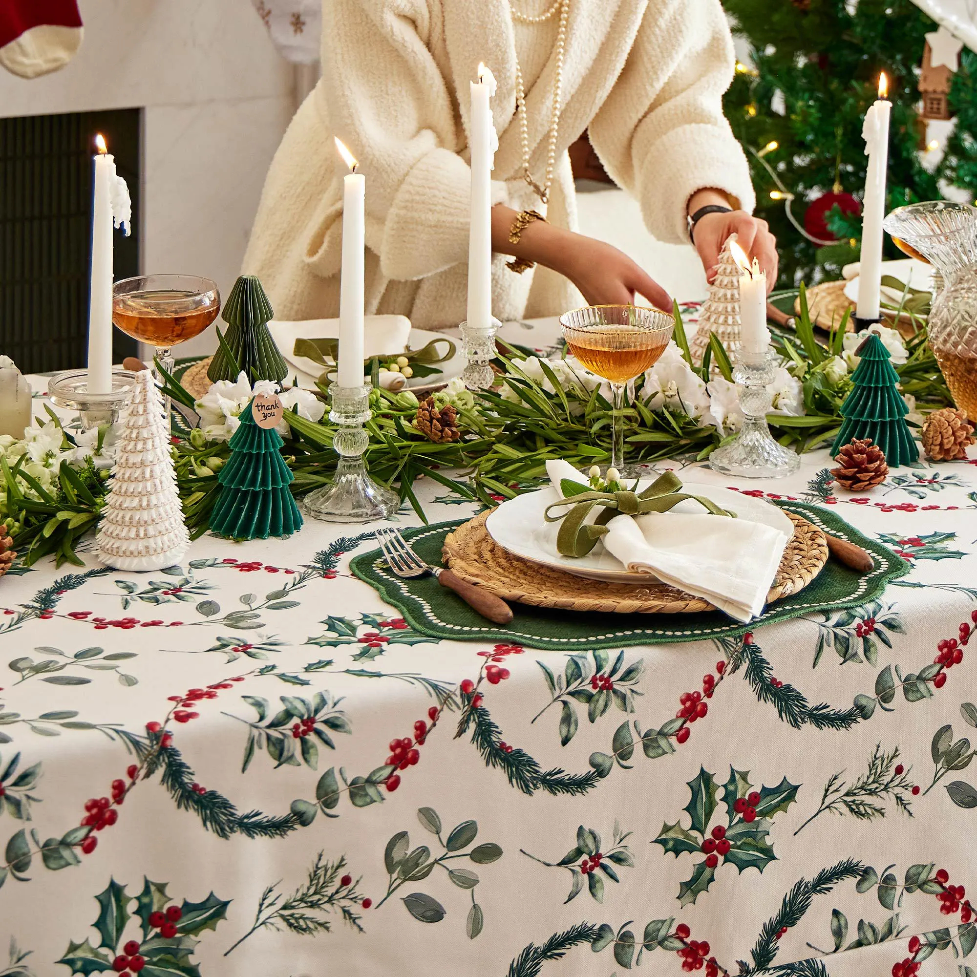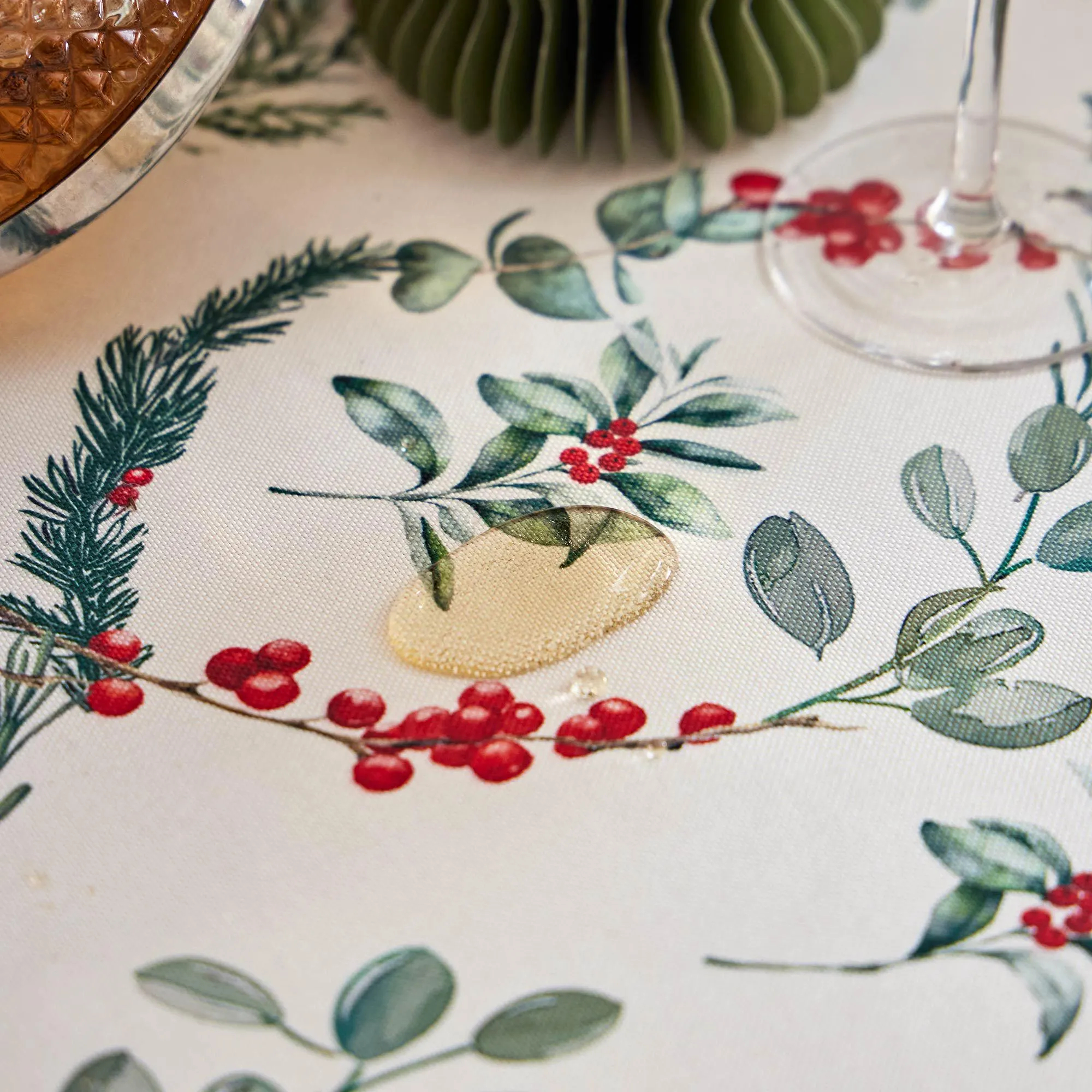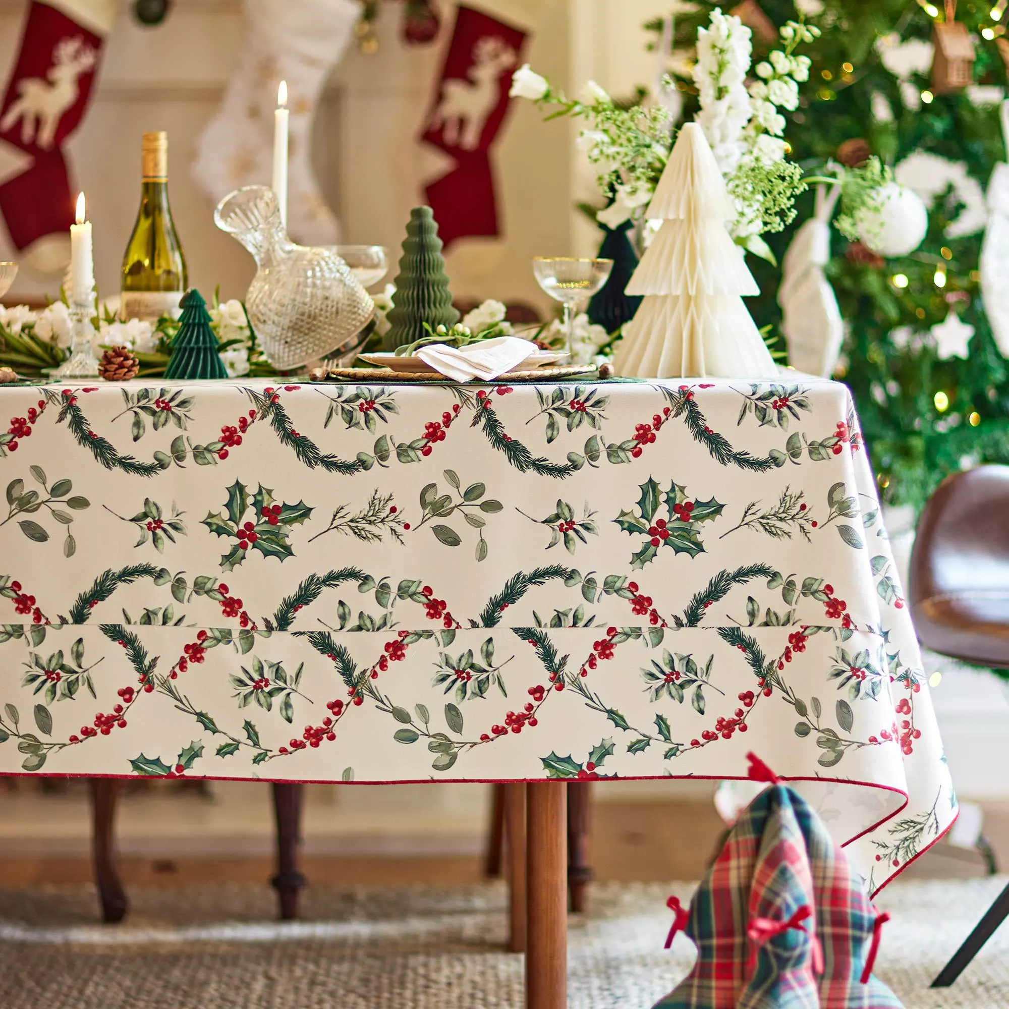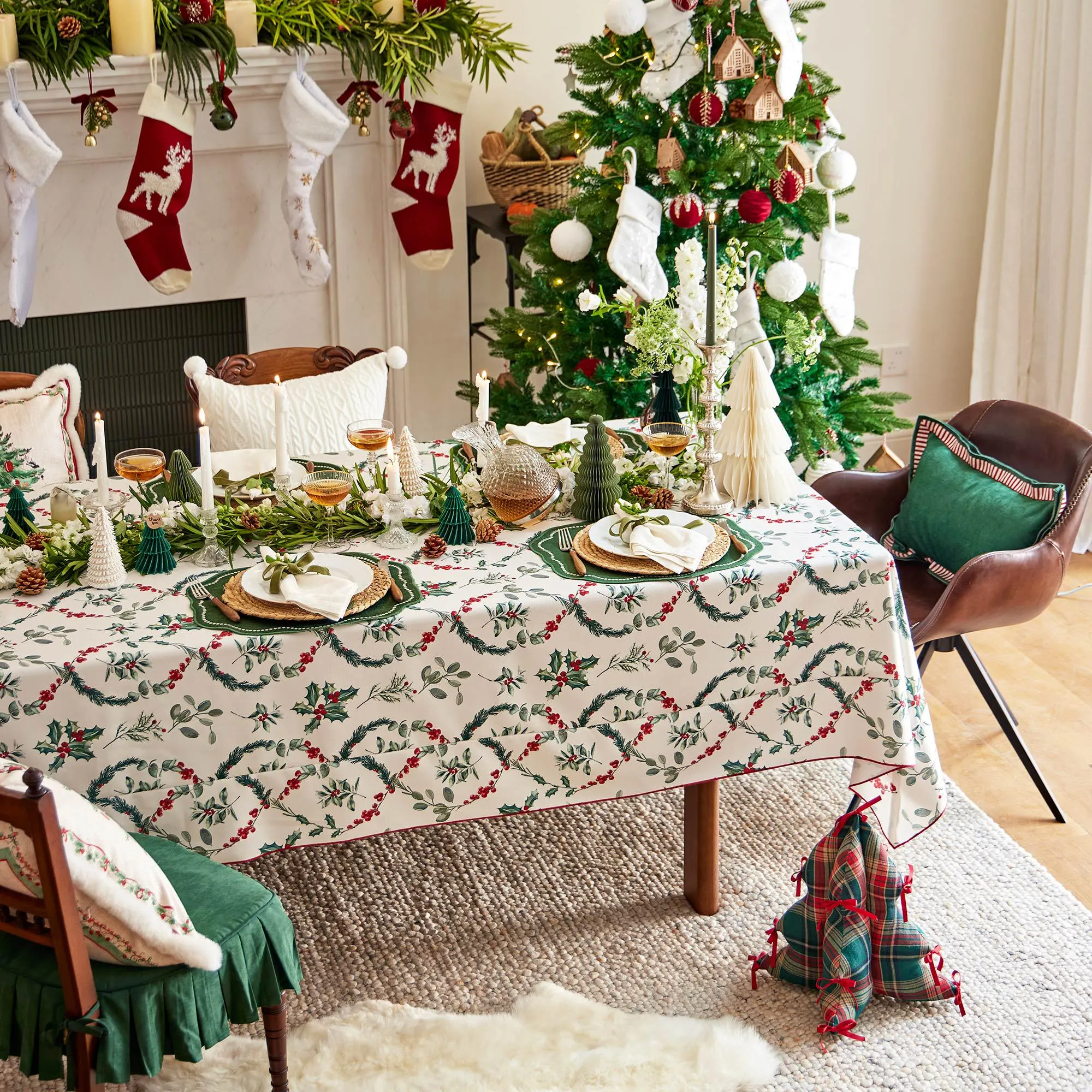 Amidst a creamy beige background, holly leaves, pine branches, and red berries form a series of small garlands, arranged diagonally. Fine red piping creates a refreshing yet restrained ambiance, perfect for both festive and everyday occasions.