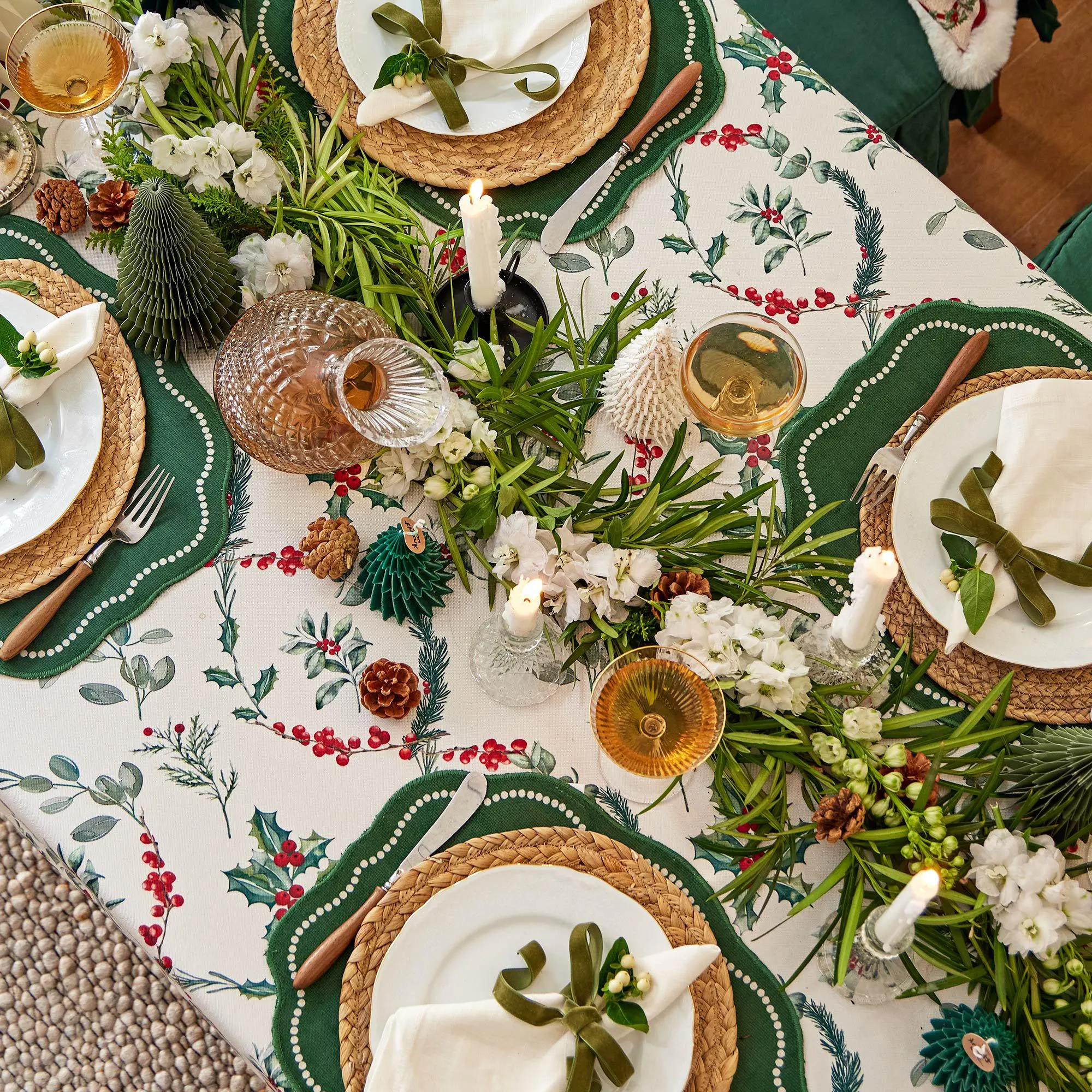 For everyday use, pair with linen placemats, wooden trays, and red and green napkin rings for a cohesive look.
