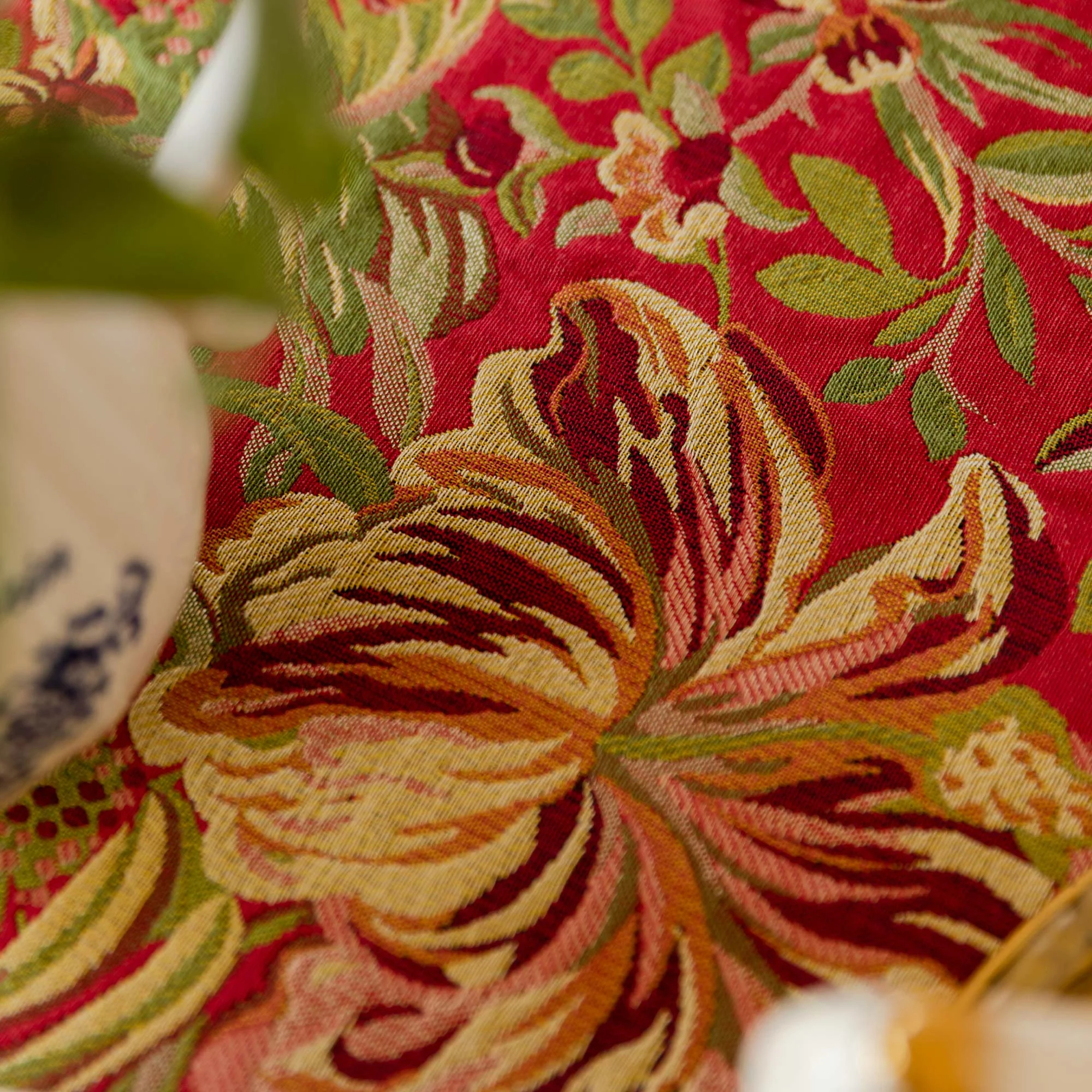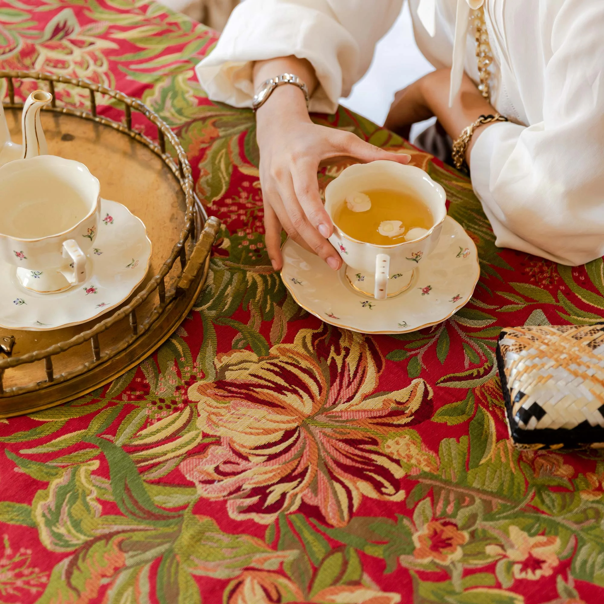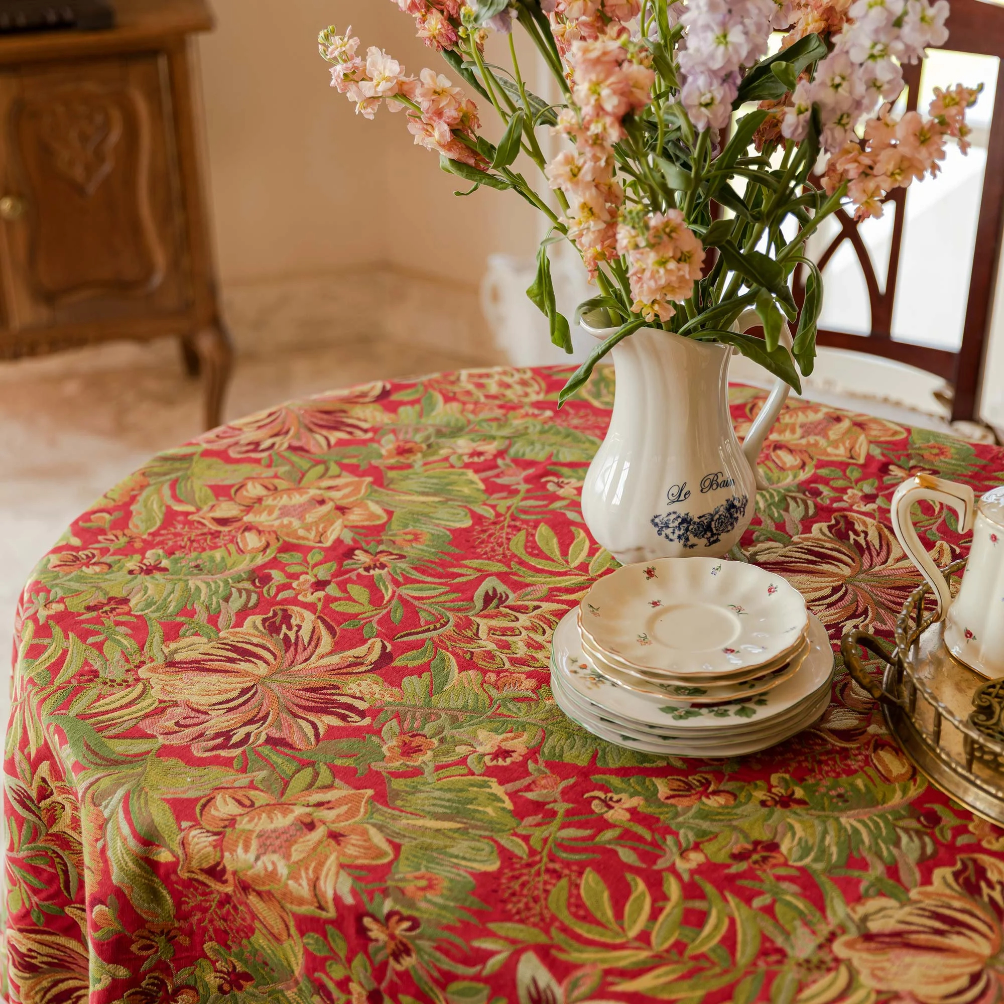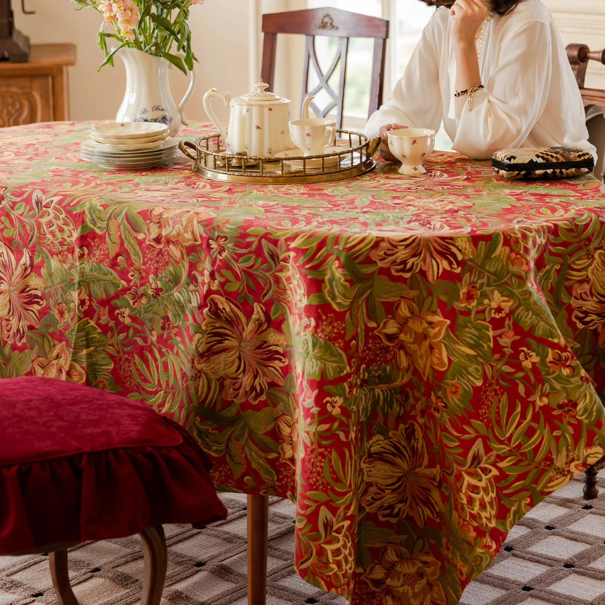 A rich vermilion base, a vibrant apricot blossoms and tender green vines fill the space, layered like a rich oil painting. The striking contrast of light and dark, combined with the ornate details, creates a striking tablescape, perfect for both everyday and festive occasions.