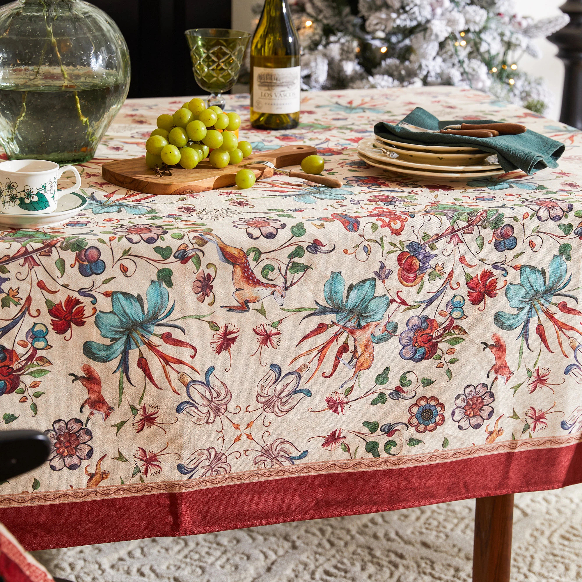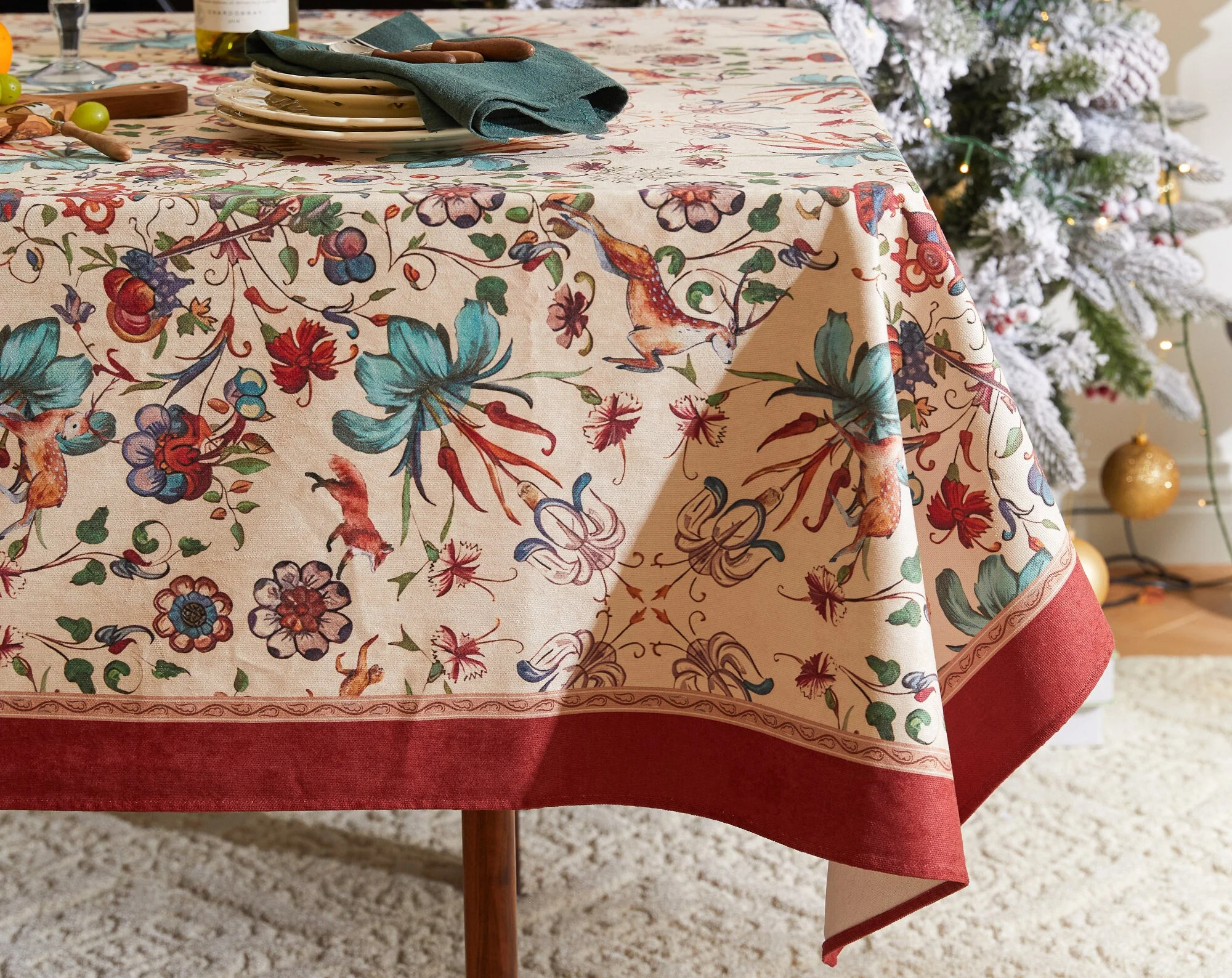 A warm beige-apricot base features hand-painted branches, butterflies, and birds, punctuated by azure floral and fruit motifs. A wide burgundy red border and delicate floral ornaments frame the tabletop, creating a retro and romantic ambiance.
