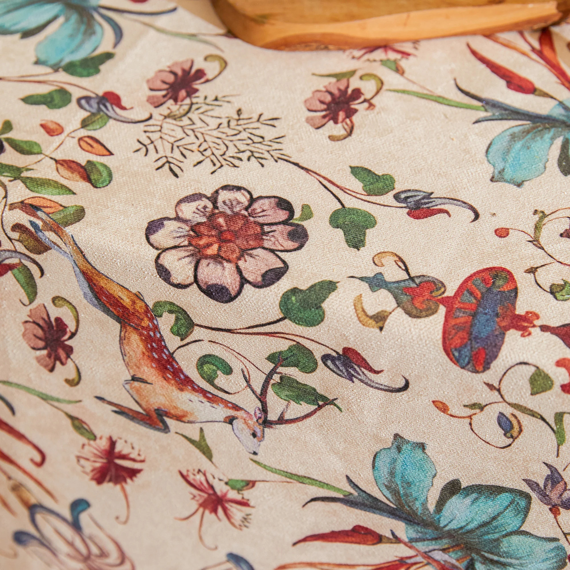 Soft color combination: The beige-apricot base is accented with azure blue, pomegranate, olive green, and amber yellow, complementing the wood tones and cream interior.
